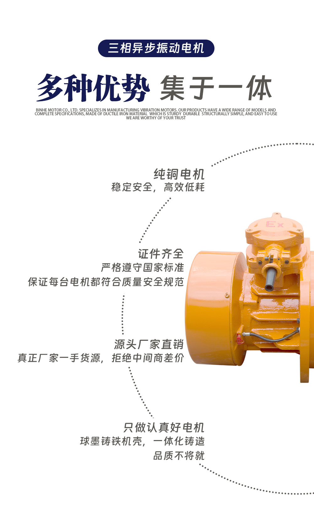 滨河电机有限公司作为一家专业研制和生产振动电机的厂家,拥有丰富的生产经验和强大的技术实力,其产品经过了严格的检测和认证,质量可靠,性能优越,深受广大客户的信赖和好评。公司秉承 “诚信经营、精诚合作、互惠互利、携手共进” 的经营理念,致力于为广大客户提供高品质的振动电机产品和优质的售后服务。